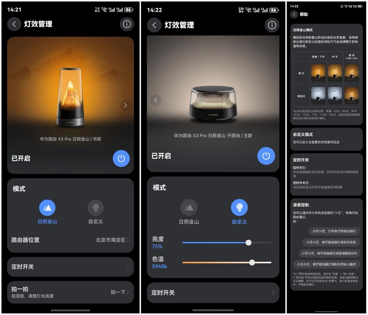 当然,在华为路由 X3 Pro 日照金山路由器的设置中,你也可以随时对灯效进行管理,对光照的亮度、色温进行随时调整。