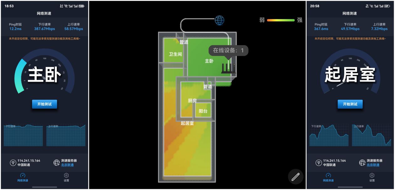 通过客观公正第三方的网络测试APP——全球网测,中国联通300M家庭带宽实际测试下来,不同房间的网速如上图所示,确实没有再出现Wi-Fi覆盖的死角位置,并且在测试过程中,子母路由连接状态均为自动切换,没有进行任何的手动干预,网络质量让我非常满意。