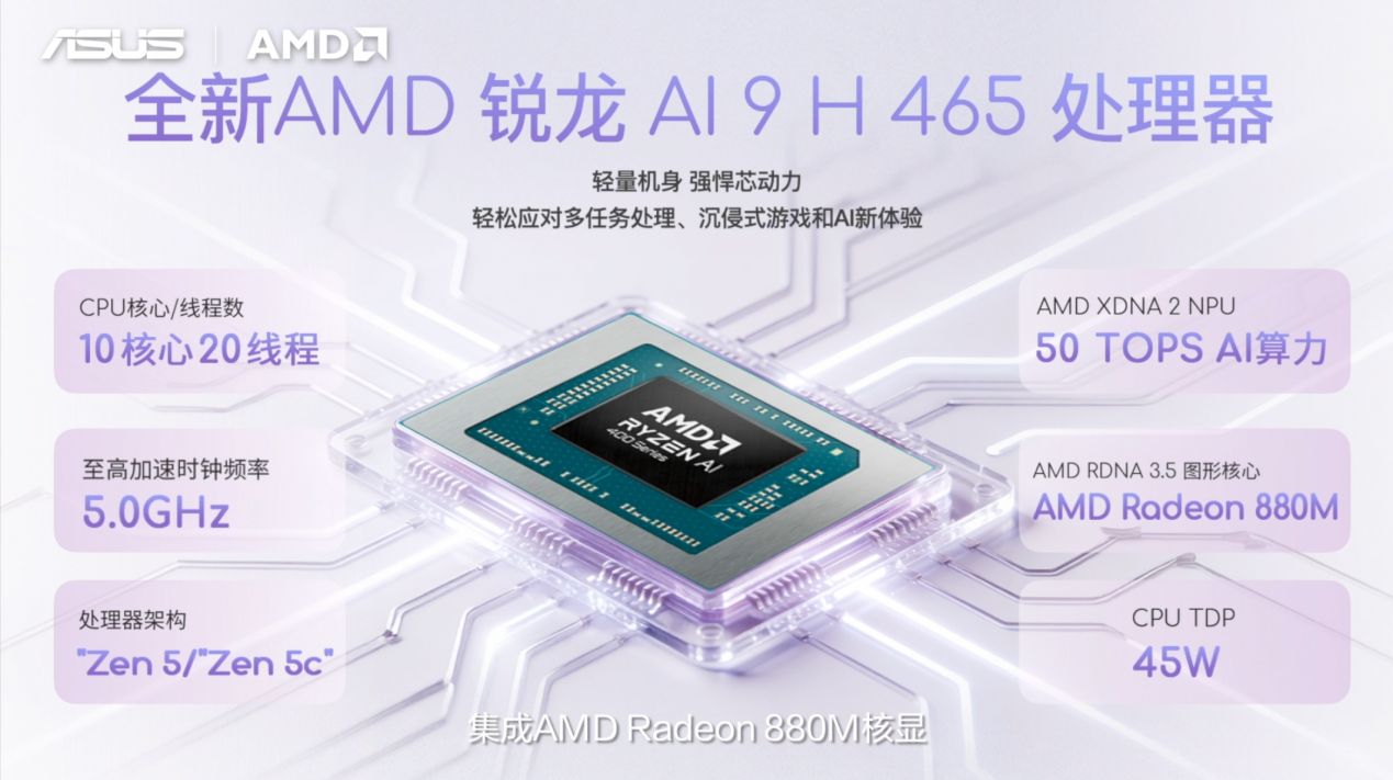 性能方面,它搭载AMD锐龙AI 9 H 465处理器,在性能与轻薄之间实现突破式平衡。该处理器采用10核心20线程设计,支持多线程多任务处理更快,满足多任务办公、游戏娱乐追剧、轻度创作、深度学习等用机场景需求,集成AMD高能核显Radeon 880M,拥有12CU图形核心数,不仅支持视频AV1硬件编解码,还能畅玩主流MOBA、FPS游戏,娱乐办公两不误。依托华硕专业调校技术,基于采用内吹风道、双风扇以及双热管设计的华硕冰锋散热架构,990g极致轻薄机身实现至高45W强劲性能释放,突破轻薄本性能上限。