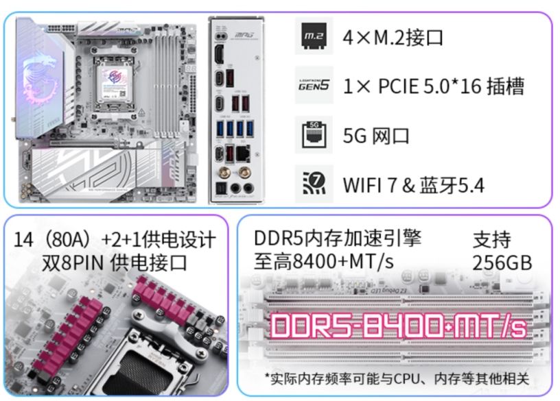 扩展插槽包括1个PCIe 5.0 x16全尺寸插槽,配备钢铁装甲,支持最新高性能显卡。内存方面搭载4条DDR5插槽,支持双通道模式,通过微星内存加速引擎与线路优化设计,最高可支持8400+MT/s频率,最大容量256GB。