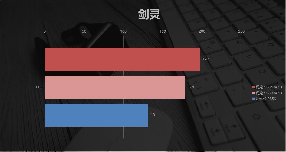 《剑灵》中,9850X3D以197 FPS领先285K的131FPS,差距约50.38%。