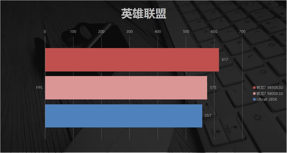 在实测的四款网游中,锐龙 7 9850X3D的帧率表现全面领先Ultra 9 285K,与同门的锐龙 7 9800X3D 则处于同一梯队,差距始终维持在合理范围。其中,《英雄联盟》里三者表现最为接近,9850X3D以617FPS 领先285K的557FPS,差距约10.77%。