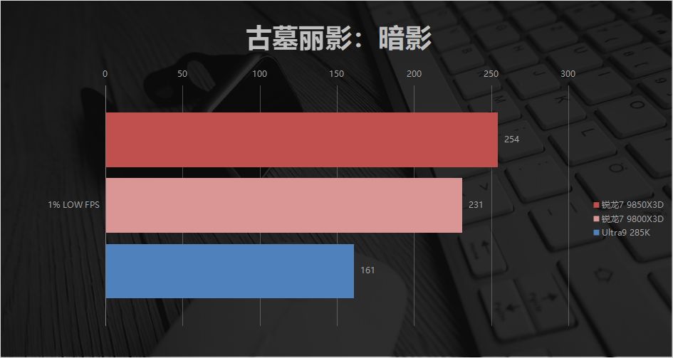 到了《古墓丽影:暗影》,9850X3D的431帧比Ultra9 285K的311帧足足领先了 38.6%。
