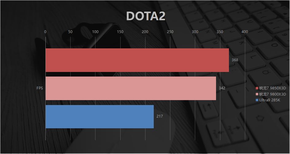 《DOTA2》的相关测试里,9850X3D的368FPS 更是比285K的217FPS 高出约69.59%。