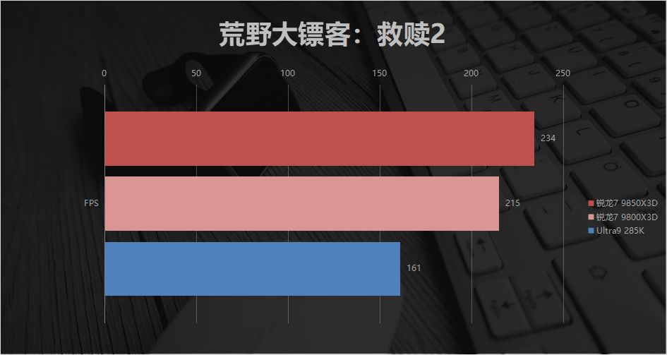 《荒野大镖客:救赎2》这边,9850X3D的234帧也比Ultra9 285K的161帧领先了45.3%。