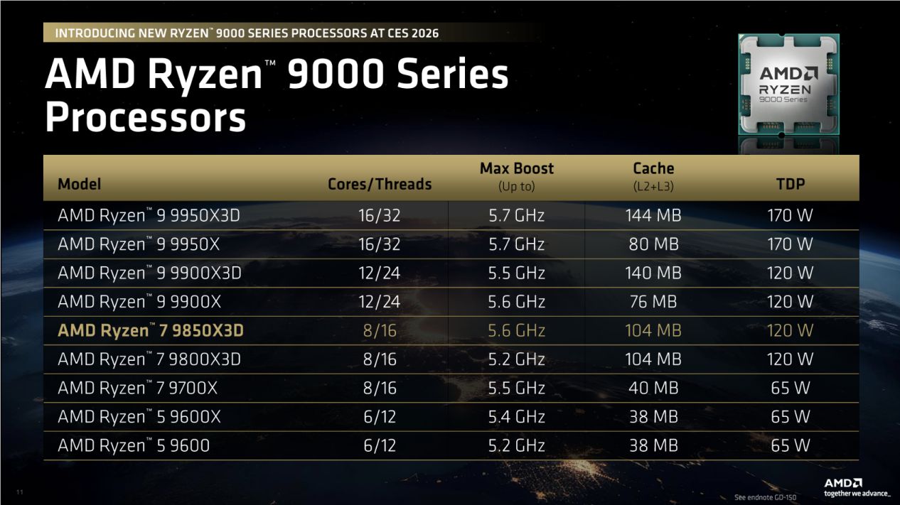 如今,X3D 系列已占据高端游戏处理器 90% 以上的市场份额,在 2026 年架构格局稳定的背景下,“打游戏,选 X3D” 的核心逻辑愈发坚挺。作为打造极致体验的千帧游戏家族,X3D 系列凭借硬核性能与专属技术加持,早已成为全球游戏玩家的首选标杆。其中锐龙 7 9850X3D 稳居性能王者之位,更是高端游戏玩家的顶级首选,同时它还凭借单通道内存兼容、低功耗等特性,降低了高端游戏 PC 的入门门槛;若想兼顾预算与游戏体验,锐龙 7 9800X3D 同样能带来超流畅的千帧表现,是高性价比之选。而整个 X3D 家族的每一款产品,都延续了极致游戏效能的核心基因,选择 X3D 系列,已然成为所有游戏玩家追求极致游戏体验的一致理念。