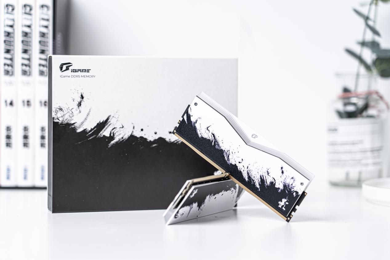 内存我们选择的是七彩虹iGame Shadow DDR5-6000 16GBx2。这款内存条的频率为6000MHz,时序为CL28-38-38-76,在DDR5 6000内存中属于超低延迟的产品。这款内存支持Intel XMP 3.0和AMD EXPO技术,采用了SK海力士的A-DIE颗粒,为其出色的超频性能和稳定的运行提供了基础。高品质合金散热马甲,内部增贴了高性能导热垫,进一步优化了热量传导。不过,独具一格的水墨设计语言才是它最大的特点,正面有泼墨图案和“影”字设计,顶部配备了支持神光同步的导光条,独特的美感展现了国创新生代品牌的特色。