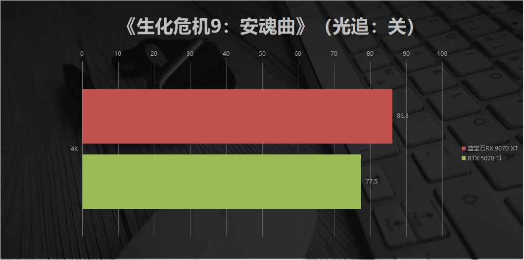 即便将分辨率拉升至4K + 超高画质,蓝宝石RX 9070 XT依旧展现出强悍的性能实力,平均帧率达到86.1fps,轻松突破4K游戏流畅运行的帧率门槛,在大场景的光影渲染、复杂的物理特效运算中依旧保持帧率稳定,无明显掉帧卡顿,让玩家能在4K超高清分辨率下体验《生化危机 9:安魂曲》的极致画面细节。而RTX 5070 Ti在相同设置下的平均帧率仅为77.5fps,落后11.1%,在4K高画质的高负载场景下,性能差距进一步扩大。蓝宝石RX 9070 XT凭借16GB大显存的充足缓冲、RDNA 4架构对高分辨率数据的高效处理能力,在4K光栅性能上再次实现对竞品的压制,也让这款显卡成为5000元档为数不多能原生畅玩4K 3A大作的优质选择。