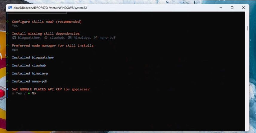 现在我们将选择一些初始功能:himalaya、blogwatcher、nanopdf和clawhub(如果在列表中找不到clawhub也别担心——可以稍后再配置)。如果系统提示,请选择npm并继续安装。