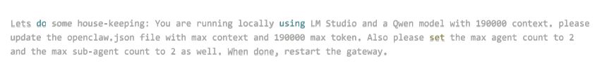 Lets do some house-keeping: :You are running locally using LM Studio and a Qwen model with 190000 context. please update the openclaw.json file with max context and 190000 max token . Also please set the max agent count to 2 and the max sub-agent count to 2 as well. When done, restart the geteway.