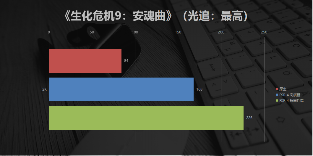 在开启光线追踪、DLSS/FSR等特效后,其性能优势依旧显著,光影渲染的细腻度与画面流畅度实现完美平衡,沉浸式游戏体验拉满。在2K+超高画质+最高光追的设置下进行测试,即使不开启任何超分技术,它也可以实现84fps的平均帧率。开启AMD FSR 4高质量挡位后,游戏画质几乎没有肉眼可见的损失,平均帧率却直接翻倍至168fps,轻松实现了2K光追下的满帧畅玩。将FSR 4调至超高性能挡位,平均帧率更是飙升至226fps,彻底解锁了光追下的超高刷体验。