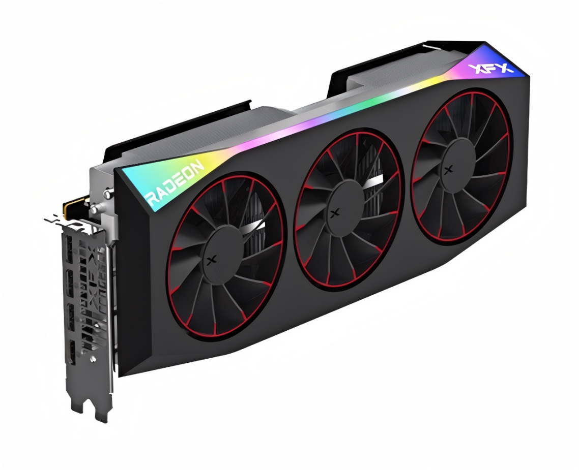 讯景这款的散热器由8根镀铜镍管、翎霜速冷磁吸涡扇、VC均热板,还有霍尼韦尔PTM7950导热贴组成,散热能力极强,能让显卡持续满血输出。顶部的RGB灯带面积很大,很吸睛。总的来说,这款更适合预算充足、喜欢追求顶级性能、机箱空间大的用户。