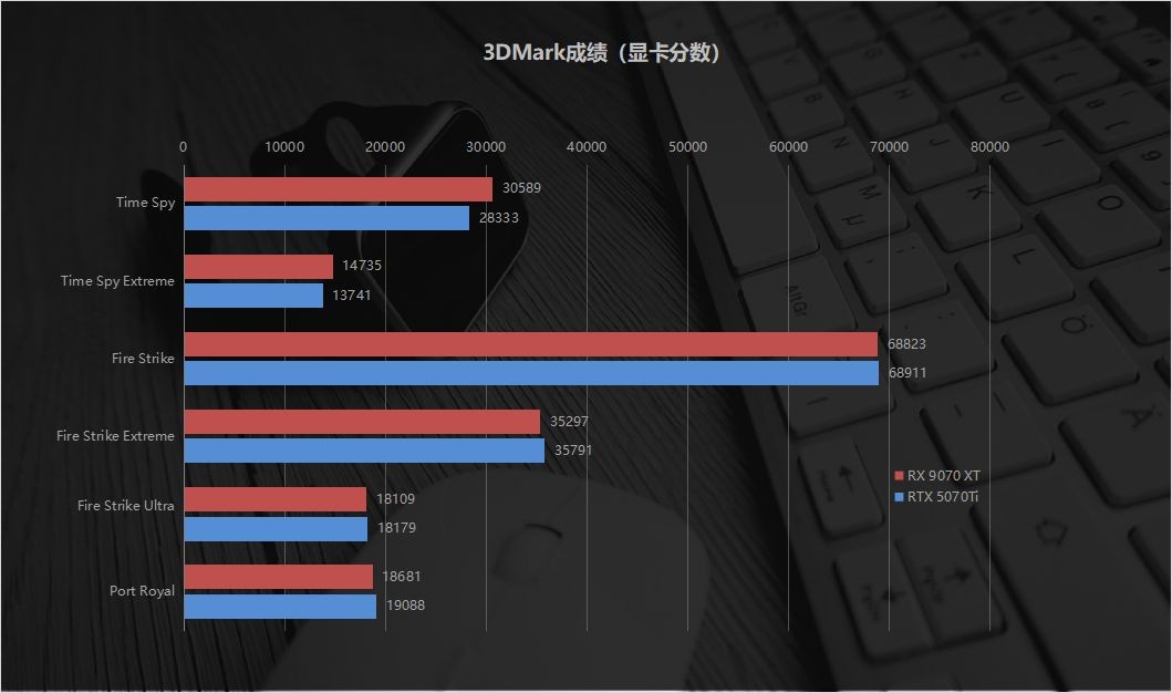 而在DX11对应的FireStrike系列测试中,RTX 5070Ti实现了小幅反超,但领先幅度也仅1%左右,如此微小的差距在实际游戏体验中几乎无法感知,二者在DX11场景下基本处于同一水准。