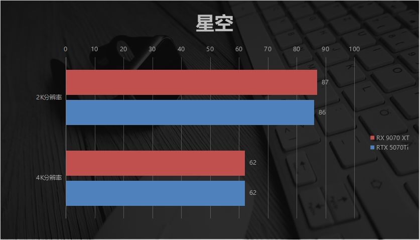 旗鼓相当的基准表现:在《星空》《赛博朋克2077》《龙腾世纪:影障守护者》三款游戏中,瀚铠RX 9070 XT与RTX 5070Ti的表现几乎完全一致,2K与4K分辨率下的帧率差距均在2%以内,肉眼完全无法感知差异,两款显卡都能实现高画质下的流畅运行。