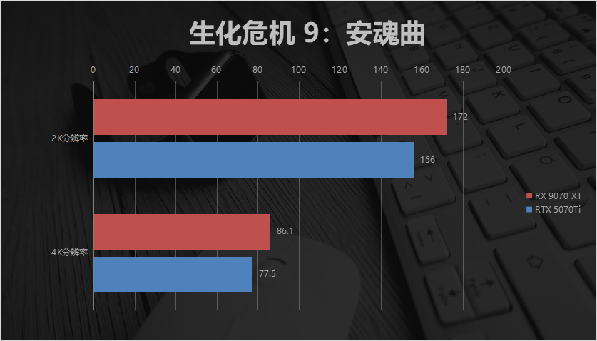 《生化危机 9:安魂曲》2K超高画质下,平均帧率172fps,对比竞品的156fps,领先幅度10.3%,轻松满足2K144Hz高刷显示器的满帧需求;即便拉升至4K超高画质,依旧跑出了86.1fps的平均帧率,对比竞品的77.5fps,领先幅度达到11.1%,原生实现4K高画质流畅畅玩。