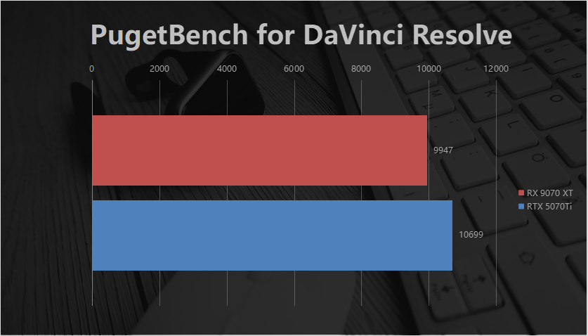 视频创作场景中,RTX 5070Ti展现出了小幅优势,PugetBench for PremierePro测试中领先约9%,DaVinciResolve测试中领先约7.5%,但二者处于同一水准,都能流畅完成4K视频剪辑、调色、渲染等工作,不会出现明显的效率差距。