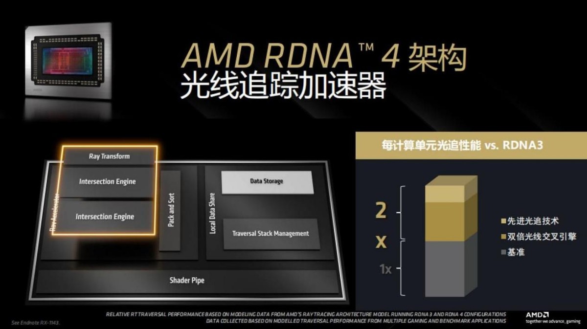 第二代AI加速器则新增了对FP8数据格式的支持,结合结构化稀疏性推理优化技术,每个计算单元的INT8吞吐量最高提升至8倍,为AI计算与FSR Redstone超分技术提供了充足的硬件支撑。