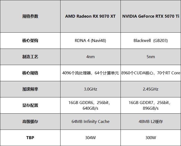 从我们整理的官方数据对比表格可以看到,作为对比的RTX 5070Ti,采用Blackwell架构GB203核心,集成8960个CUDA核心与70个RTCore,加速频率2.5GHz,搭配16GB GDDR7显存、256-bit位宽,显存带宽896GB/s,配备48MB L2缓存,官方TBP功耗300W。从纸面参数来看,二者各有侧重,RTX 5070Ti在显存带宽与光追硬件规格上有小幅优势,而RX 9070 XT则凭借更高的核心频率、更大的高速缓存,在光栅化性能上拥有天然优势。