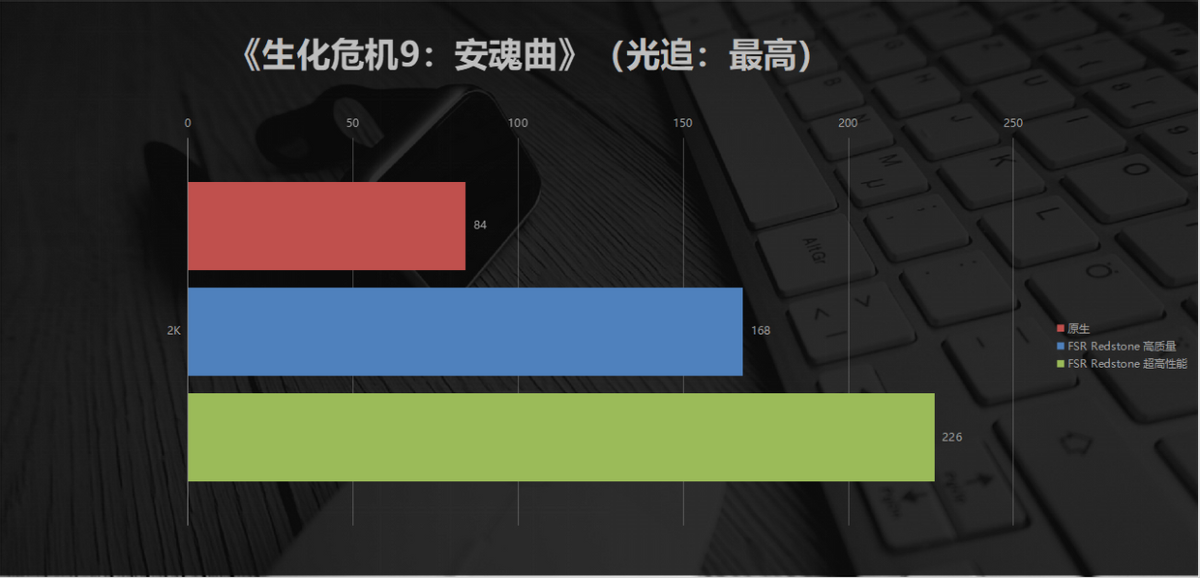 光追性能测试中,2K超高画质+最高光追设置下,即便不开启任何超分技术,瀚铠RX 9070 XT依然能达到84fps的平均帧率,流畅度完全拉满;开启FSR Redstone高质量挡位后,画质无肉眼可见损失,帧率直接翻倍至168fps,实现2K光追满帧畅玩;调至超高性能挡位后,帧率更是飙升至226fps,达到原生光追帧率的2.7倍,彻底解锁光追高刷体验。