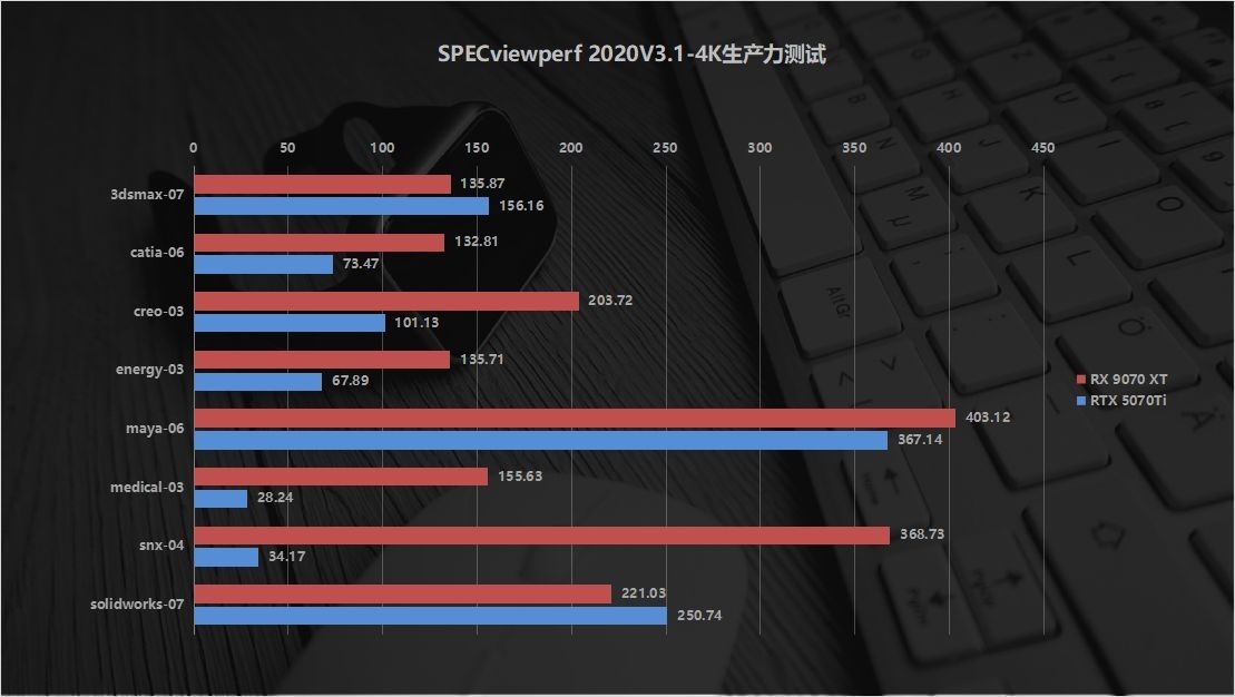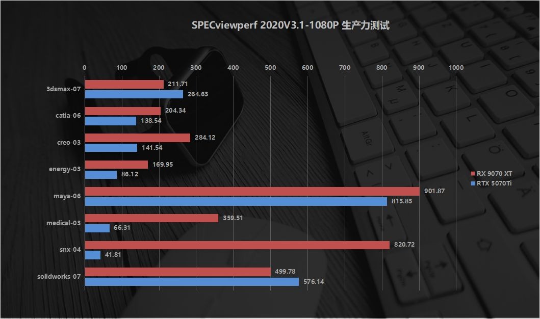 而在3D建模、工业设计等专业场景,瀚铠RX 9070 XT实现了断崖式领先。SPECviewperf2020测试中,除了3dsMax、SolidWorks两个项目竞品小幅反超,其余绝大多数场景,瀚铠RX9070XT都以绝对优势领先,在CAD/CAM/CAE应用的snx-04场景中,性能差距甚至达到十几倍,综合生产力性能领先幅度巨大。