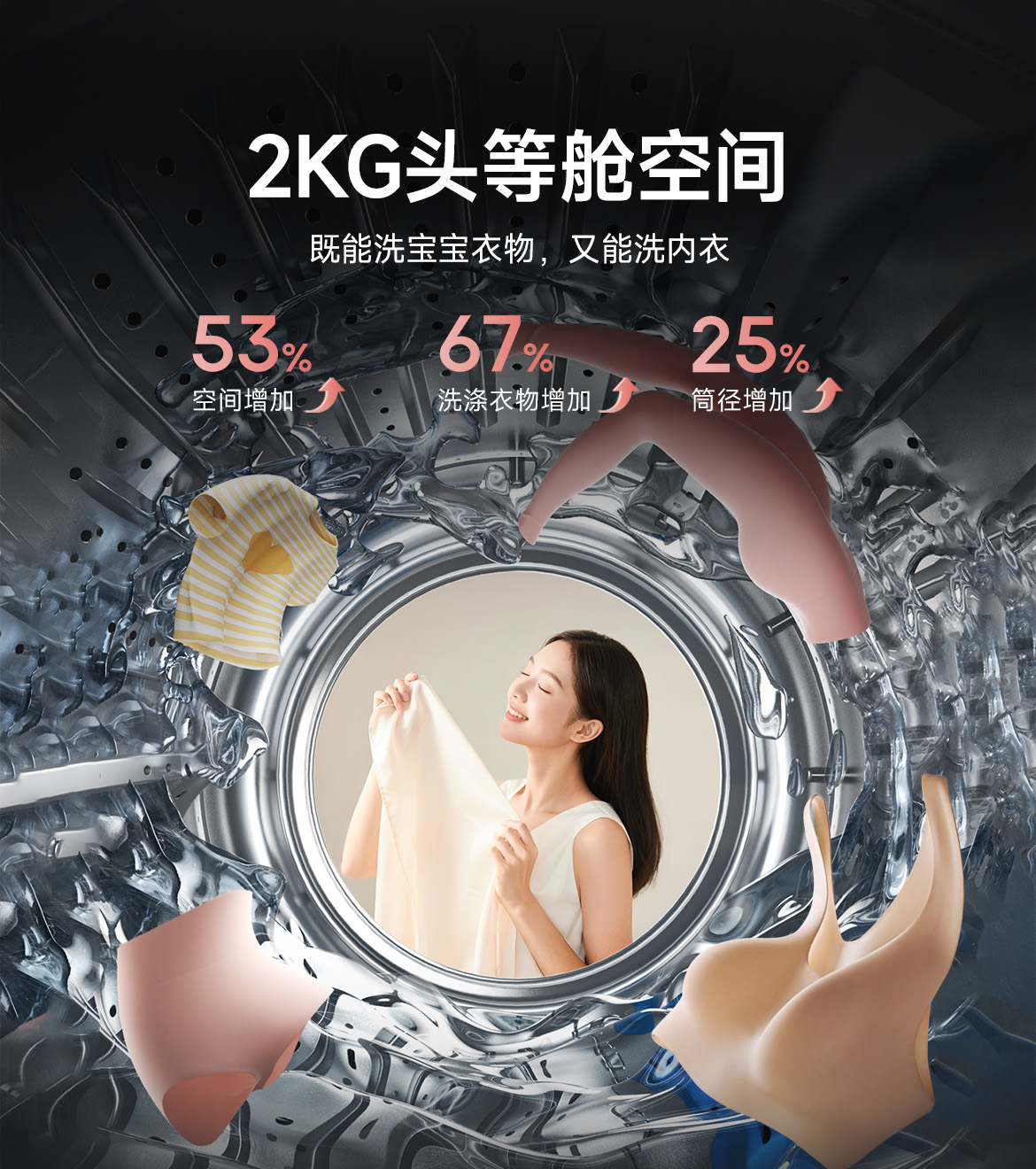 “小奶片”采用圆润轻盈的极简美学设计,洁白纯净的机身犹如一块小小的奶片,能够自然融入各种家居空间,2kg的容量专门针对宝宝衣物和贴身内衣的日常洗护需求设计,解决了大容量洗衣机“小衣物洗不净”的尴尬。