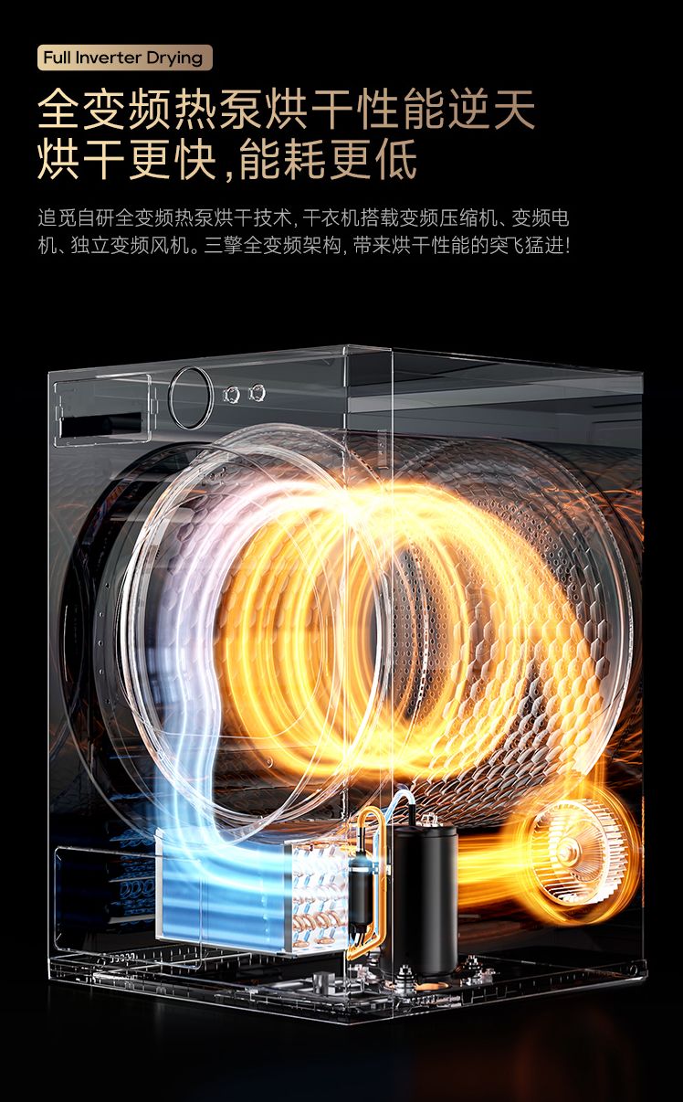 “放肆”的自由:效率与节能不再二选一: 30分钟快烘1kg衬衫,让你应对临时出门场合从容不迫;同时,能耗降低20%,意味着你再也不用为“烘一次衣服要花多少电费”而纠结。高效与省电本是矛盾体,但全变频技术通过持续高效的平稳运行,而非反复启停的能耗浪费,实现了二者的统一。