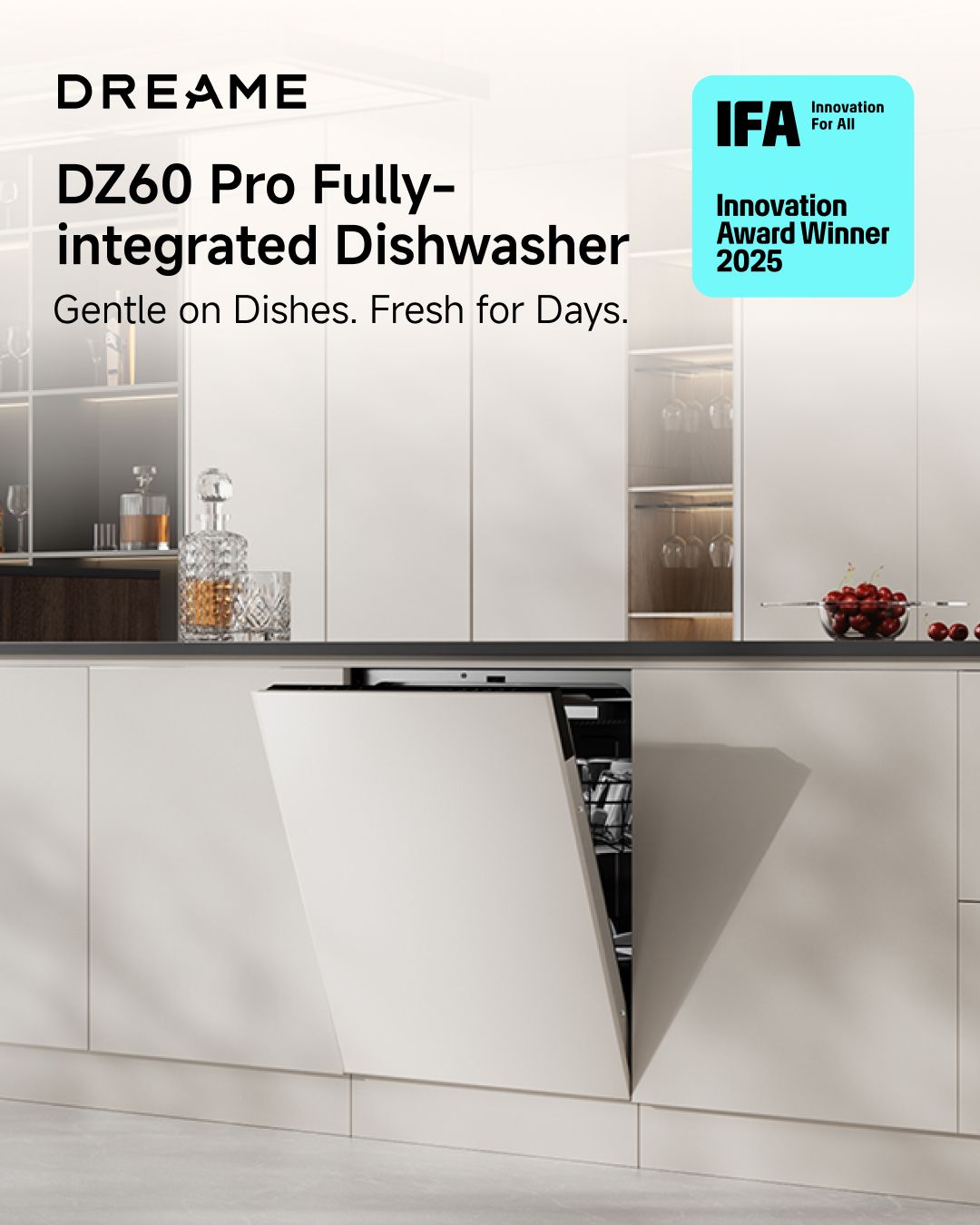 在洗碗机领域,追觅展现出强劲的技术突破能力。海外明星产品DZ60 Pro全嵌式洗碗机荣获IFA创新奖项,搭载360°水旋流洗净系统与3层6喷臂设计。其独家的FlexWing灵动振翼喷臂,两端可实现25°摆动,在高压水流下实现立体冲涮,配合75°C高温煮洗,实现碗筷随手摆、洁净如新。