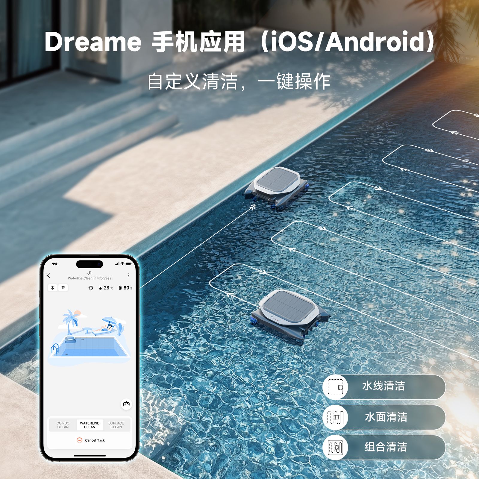 从地面到空气,再到泳池水面,J1不仅是一台智能水面清洁机,更是“能源自驱、算法自控、维护自减”的一体化系统。