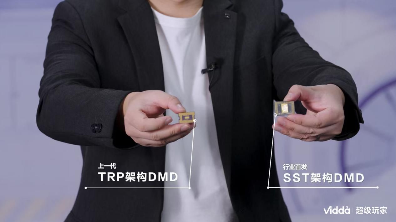 发布会一开场,Vidda便直接拆解C5,展示其与市面常见投影截然不同的内部结构。核心三大部件——SST架构DMD芯片、双MCL39激光器和Φ122mm影院级大镜头构成了C5的技术基石。其中,SST架构DMD芯片功率密度达前代三倍,支持亮度跃升至10000流明级别;双MCL39激光器配合一体成型液冷散热,确保6800 CVIA高亮度稳定输出;而按专业影院规格定制的Φ122mm大镜头,内含17片全玻璃镜片,解析力超10万级,还配备7级可变光圈,可根据不同光线环境智能调节。