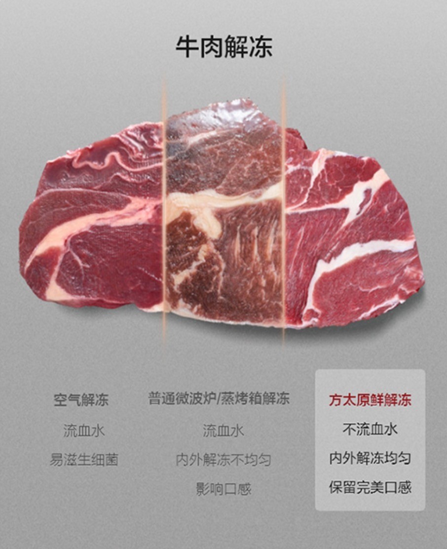 原鲜解冻科技则是方太对传统解冻痛点的彻底革新。自然解冻血水横流、微波解冻外熟内生——这些困扰无数家庭的解冻难题,终于有了答案。方太采用-3℃微冻、金属超导解冻与空气扰动系统三重协同,让冷冻食材温度缓慢、均匀回升,冰晶不刺破细胞,汁液不白白流失。检测数据显示,牛里脊解冻后汁液流失率仅2.8%,远低于普通冷藏解冻的7.2%。上海海味观主理人、米其林餐厅星厨黄君评价:“这项技术让食材始终保持在最佳状态,使家庭烹饪也能达到专业水准的口感体验。”