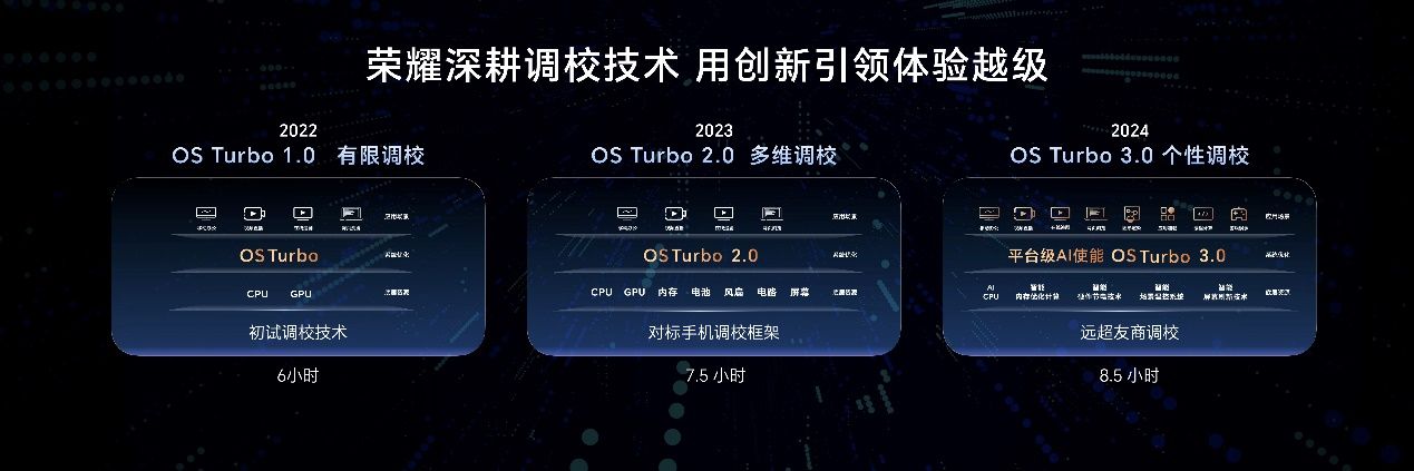 荣耀深耕调校技术多年,从2022年OS Turbo 1.0有限调校、2023年OS Turbo 2.0多维调校,到2024年OS Turbo 3.0个性调校,再全面进化至HONOR Turbo X全域调校,荣耀用创新持续引领PC体验越级。