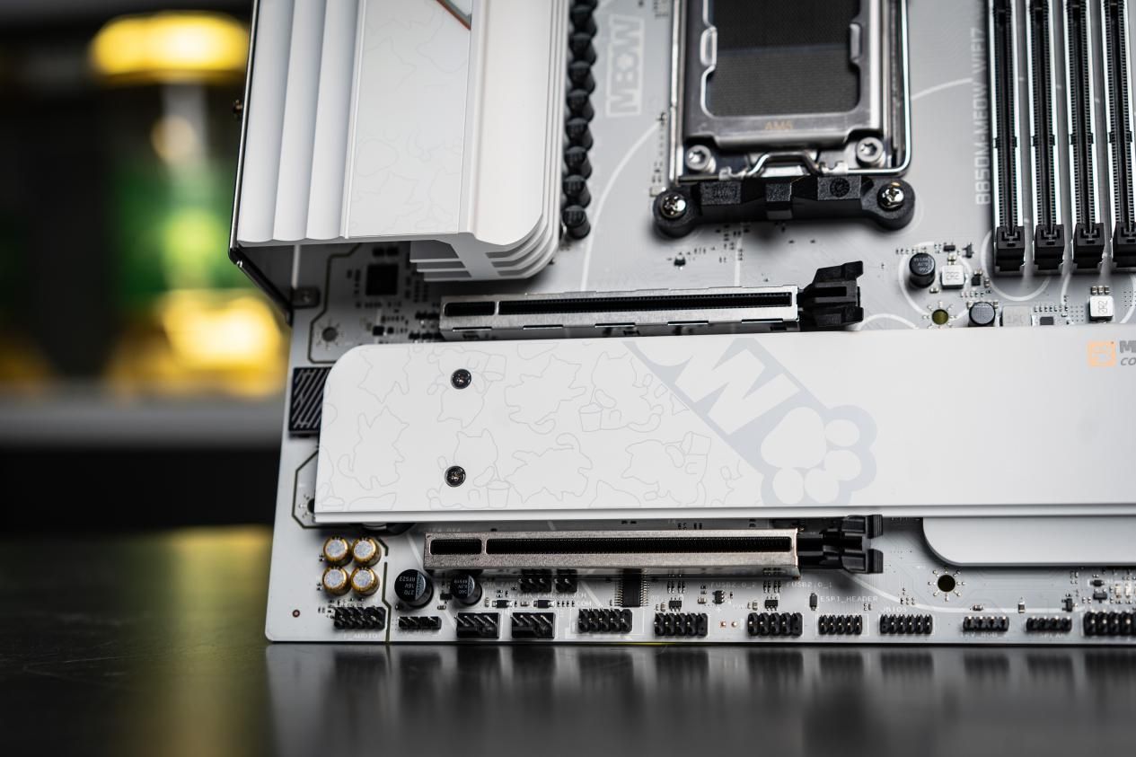 性能上,10+2+1(55A)相供电规格充分释放锐龙9处理器性能;4*DDR5合金插槽支持高至8000MHz(OC)高频;双M.2接口涵盖PCIe5.0 x4和4.0 x4规格;同样配备5G+WIFI7电竞网卡,实现“赛博撸猫”与“疾速竞技”自由切换。是一款专为热爱白色主题、追求个性与高性能且钟情猫咪元素的玩家量身打造。