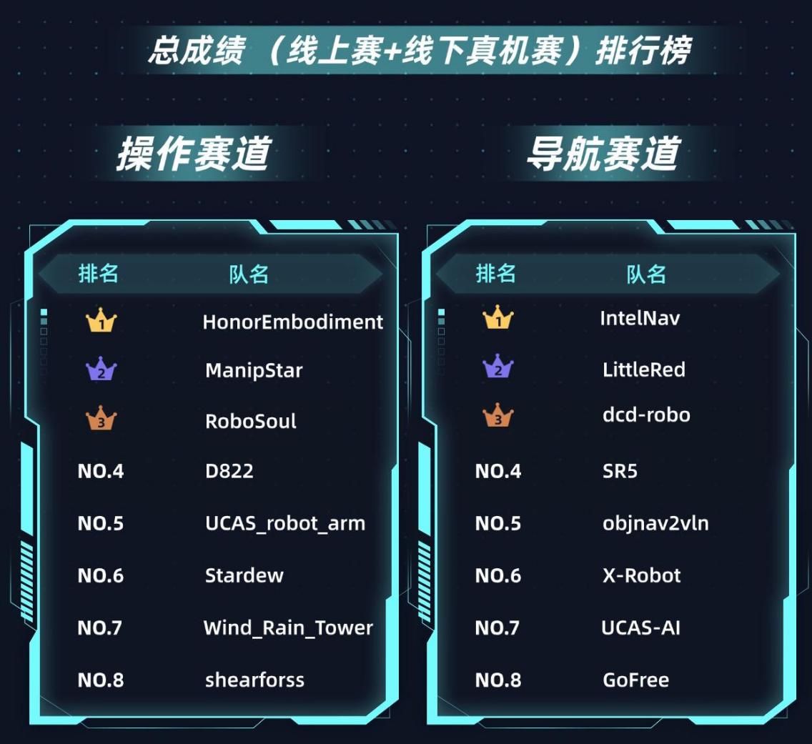 而荣耀机器人团队凭借“仿真预训练 + 真机轻量化微调”的路径,不仅有效攻克了这两大难题,实现高效部署与高精度执行,还在1小时的线下决赛中展现出“开箱即用”的硬实力——机器人全程稳定运行,任务完成率远超第二名30个百分点,最终以绝对优势摘得冠军,充分彰显出团队领先的具身AI工程落地部署能力,也为具身智能技术从实验环境走向真实应用按下了“加速键”。