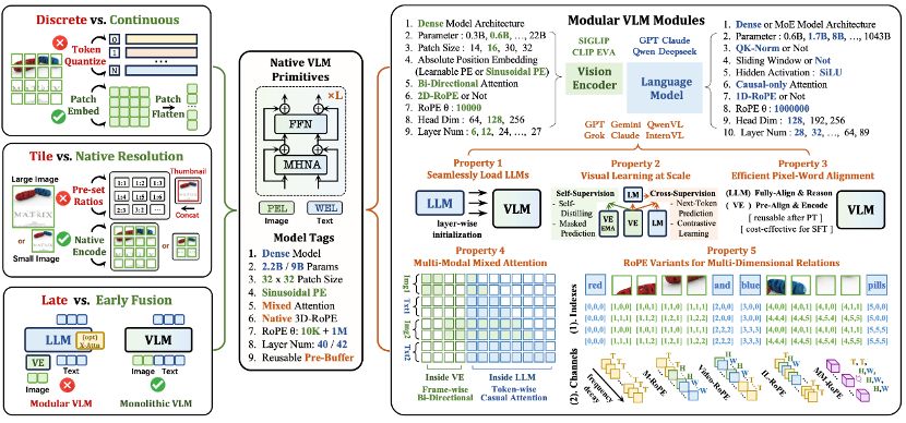 当前,业内主流的多模态模型大多遵循“视觉编码器+投影器+语言模型”的模块化范式。这种基于大语言模型(LLM)的扩展方式,虽然实现了图像输入的兼容,但本质上仍以语言为中心,图像与语言的融合仅停留在数据层面。这种“拼凑”式的设计不仅学习效率低下,更限制了模型在复杂多模态场景下(比如涉及图像细节捕捉或复杂空间结构理解)的处理能力。