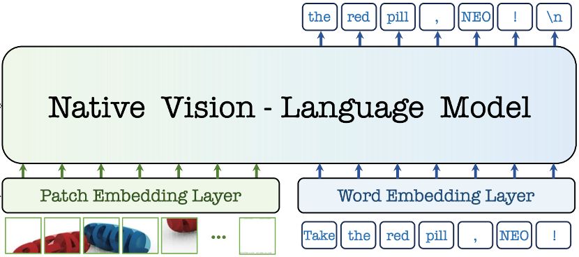 - 原生图块嵌入 (Native Patch Embedding): 摒弃了离散的图像 tokenizer,通过独创的 Patch Embedding Layer (PEL) 自底向上构建从像素到词元的连续映射。这种设计能更精细地捕捉图像细节,从根本上突破了主流模型的图像建模瓶颈。