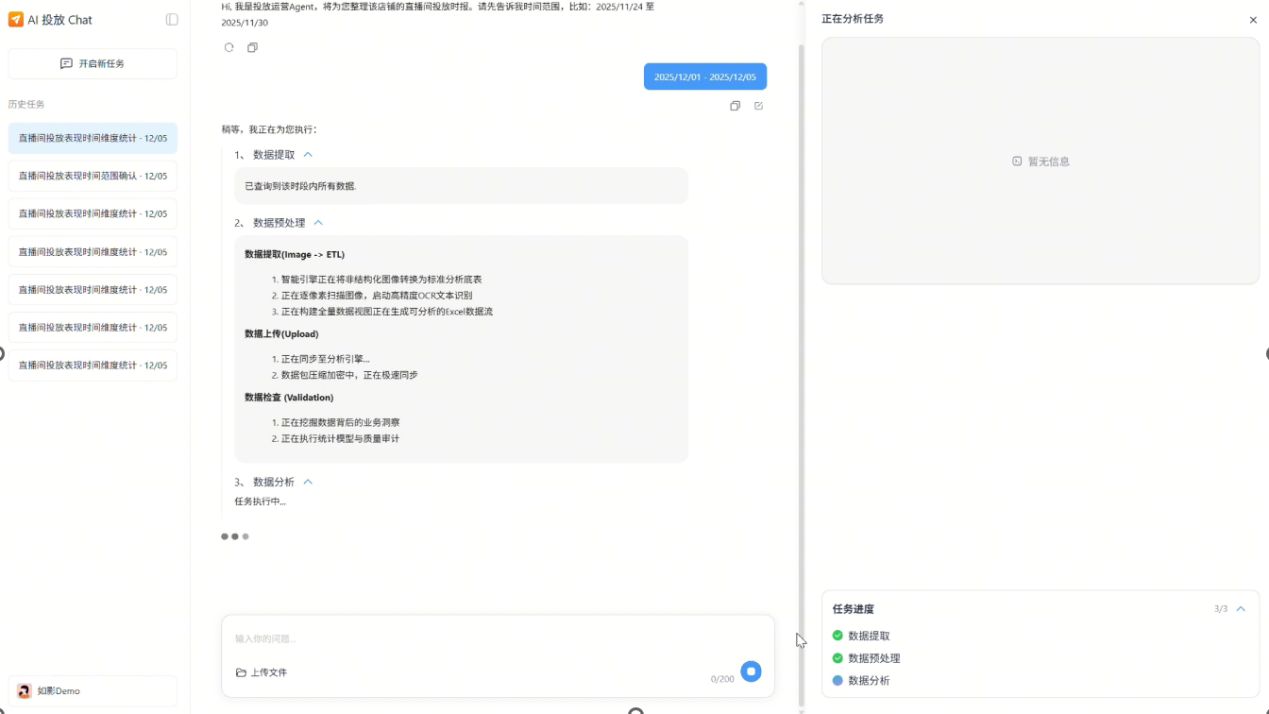 通过直播运营Agent,用户只需在直播前配置好任务,下播后即可自动产出包含品牌层汇总报表、异常波动标注及优化建议的深度分析。实测数据显示,完成同等质量的运营复盘,耗时从原本2小时骤降至20分钟,单任务提效高达6倍。
