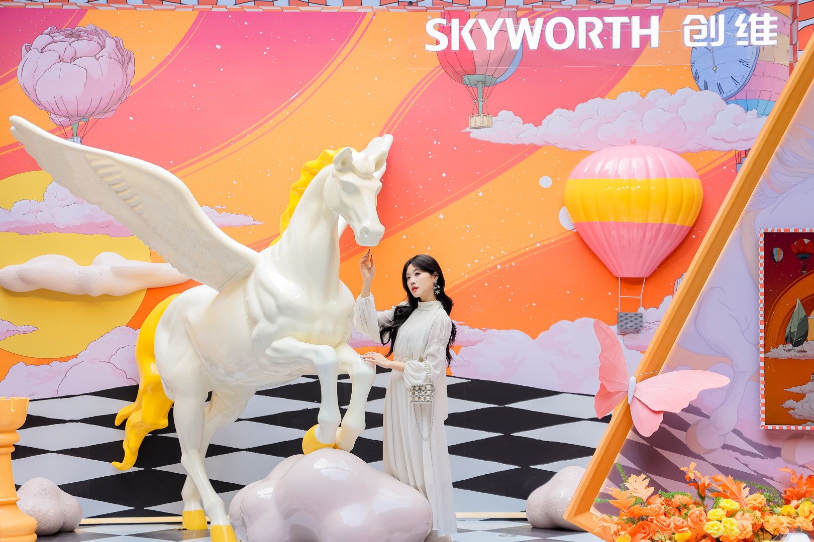 步入展区,观众仿佛迈入壁画世界,设计师笔下的元素跃出二维平面,在现实空间被拓展、放大、立体化呈现。洁白的飞马雕塑凌空展翼,国际象棋棋盘化作地面艺术装置,蝴蝶与鲜花在画框四周翩跹环绕,共同编织出一场可感、可触、可步入的沉浸式美学空间。“这不像是一个电视展,更像是一场高级艺术展。”专程从广州前来观展的设计师王女士感叹道,“尤其是飞马设计,既充满高级感,又带着马年的吉祥寓意,我太喜欢了!”