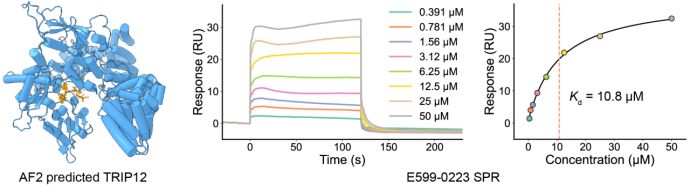 DrugCLIP 的价值不仅在于算力的飞跃,更在于其对全新靶点的硬核筛选能力。针对此前既无实验结构、也无已知抑制剂的“暗靶点”——人源 E3 泛素连接酶 TRIP12(与癌症和帕金森相关),DrugCLIP 直接基于 AlphaFold2 预测的蛋白结构进行盲筛,成功命中多个活性抑制剂。