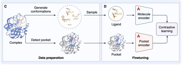 - 多尺度表征对齐: 团队通过训练两个深度神经网络编码器,将蛋白口袋的 3D 拓扑结构与小分子的化学表征映射到同一个高维共嵌入空间(Joint Embedding Space)。