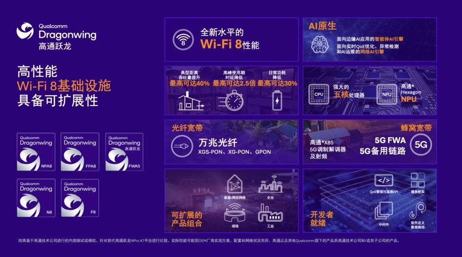 · 五款全新的高通跃龙网络基础设施平台,将带来迄今为止最全面的、可扩展的Wi-Fi 8网络产品组合,集成终端侧AI计算、高性能处理能力,以及集成式5G和光纤宽带支持。