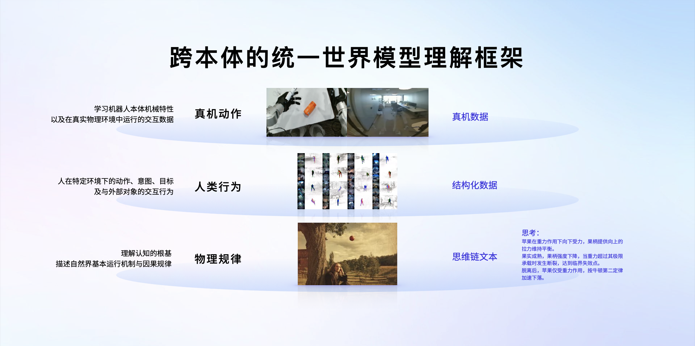 得益于原生架构的优势,该模型不再依赖昂贵且稀缺的真机数据,而是通过内化物理规律、推演因果逻辑,在更优的模型与数据规模下,实现强泛化、长时序推理与可靠的端侧部署。它能精准解析物体受力、重心、摩擦等物理约束,完成复杂任务的推理、规划与可行性分析,兼容多模态传感器指令,高效理解机器人动作与人类行为逻辑,实现从 “执行指令” 到 “理解任务” 的本质跨越。