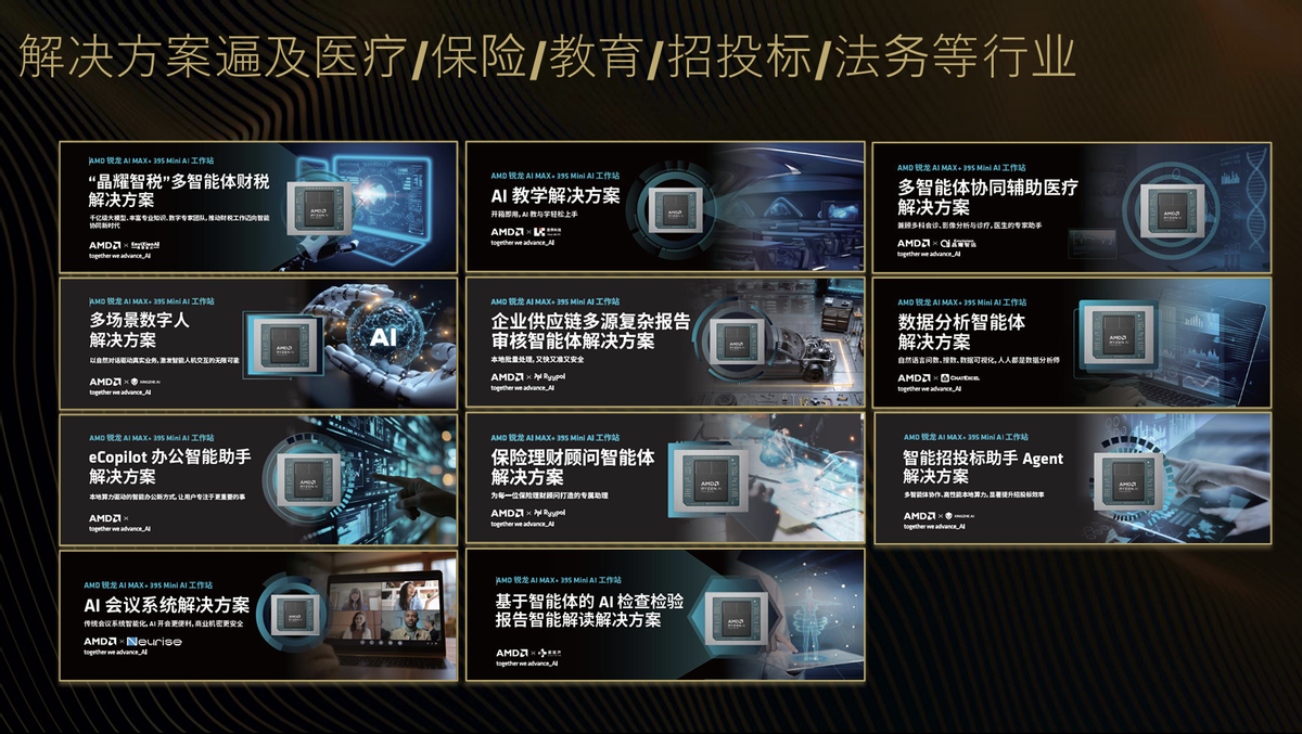 面向企业端,首界科技的玲珑星核Nova AI开发套件实现AI工具链“开机即用”,简化了模型部署的繁琐步骤;赛博物联的智能投标解决方案打造了桌面级一体机,本地化大模型让标书编制效率提升且数据安全可控;腾达泰源的智域双生AI工作站创新“OPC一机双用”架构,实现AI环境与办公环境物理隔离,一键切换的设计让AI能力无缝赋能日常办公。各解决方案均基于锐龙AI MAX+395的本地算力打造,形成了“硬件底座+场景应用”的完整生态,覆盖教科研、医疗、企业服务等核心领域。