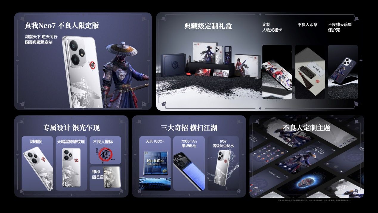 2025年1月3日,真我联手顶级国漫IP《画江湖之不良人》带来重磅联名之作——真我Neo7不良人限定版,其以不良帅天暗星人物IP、不良帅面具、不良人徽标为核心元素,从外观到系统主题、UI动效进行全量定制,并精心设计了限定礼盒套装和定制周边。目前,真我Neo7不良人限定版已于1月3日16:30开启预售,1月6日20:00正式开售,内存配置为16GB+512GB,售价2899元。