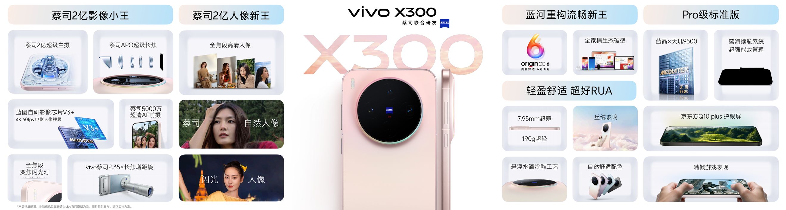 定位“蔡司2亿影像双旗舰”的vivo X300系列在vivo X300 Pro上带来了蔡司APO 2亿超级长焦能力再突破,并在vivo X300上实现了蔡司2亿超级主摄的突破性升级。vivo X300系列搭载的蓝晶×天玑9500旗舰平台,与vivo自研蓝图影像芯片V3+“双芯合体”,带来行业领先的4K视频创作能力。此外,vivo定义天玑9500的影像超能效NPU区域,大幅提升运动抓拍能力。在影像实力跃升的同时,vivo X300系列也带来了旗舰性能的全面进化,实现vivo X300 Pro在室温环境下安兔兔跑分突破410万大关。vivo X300系列还搭载由“蓝河流畅引擎”技术重构的全新OriginOS 6,具备优异的持久流畅表现。