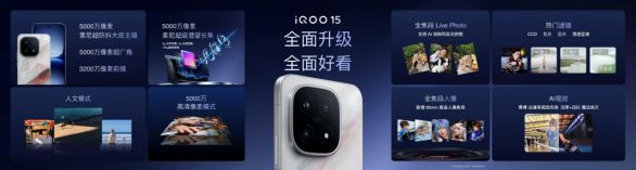 全面升级,全面好看。iQOO 15 配备后置 5000 万像素索尼超防抖大底主摄、5000 万像素索尼超级潜望长焦和 5000 万像素超广角以及3200 万像素前置镜头,并得到蓝厂旗舰同款 NICE 算法和大模型画质增强双重技术加持,拍摄出来的照片细节更清晰,大片感十足。另有全面升级的全焦段 LivePhoto、高像素模式、全焦段高像素人像模式和 AI 视效等影像玩法,用 iQOO 15 拍风光拍人文,全面好看。