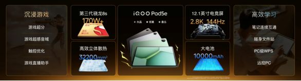 “永劫无间手游和王者荣耀职业联赛双推荐平板”iQOO Pad5e,它搭载第三代骁龙8s、12.1 英寸高清电竞屏、3W+mm² 高效立体散热、10000mAh 大电池,硬实力不虚,游戏超分更是同档断层领先,PC级WPS+ CAJViewer 更是专业生产力升级,学习办公超轻松;iQOO WATCH GT 2 搭载屏占比高达 82.4% 的 2.07 英寸超亮全景屏,局部峰值亮度 2400 尼特,配有 100 多种运动模式,不但可以记录心率、热量等数据,还具备全新电竞模式、接入满血版 DeepSeek 的蓝心小 V 和碰一碰遥控器,33 天超长续航,更是做到全天候健康监测;iQOO TWS 5 全链路游戏延迟低至 42ms,四麦自适应降噪,降噪深度飙至 60dB,拿下 A+ 级 CAIA 降噪能力认证,并有升级的 Monster Sound 电竞声效和 48 小时超长续航,体验更好的跨生态无缝三连接和实时智慧翻译,全新主题弹窗,更有 KPL 电竞选手无畏定制弹窗和定制提示音,是专为游戏玩家打造的旗舰降噪耳机。