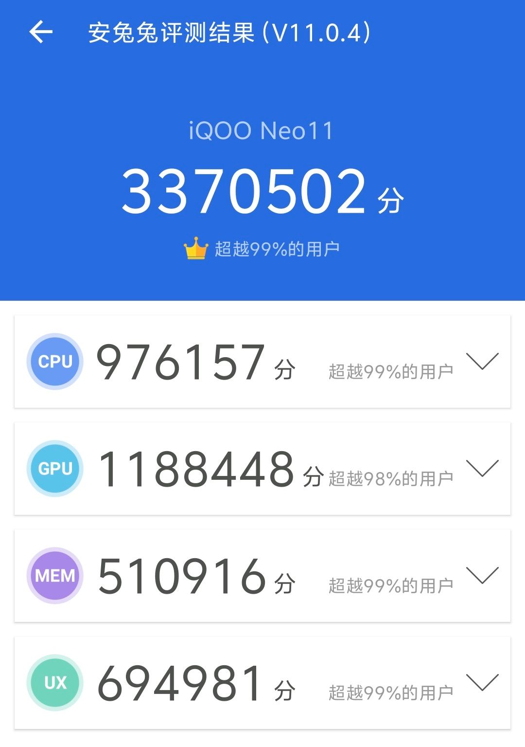 iQOO Neo11的性能核心,是骁龙8至尊版+自研电竞芯片Q2的“双芯组合”,配合Monster超核引擎的调度优化,实测安兔兔跑分可以轻松突破337万,仅GPU得分就比上代提升15%,这种硬件实力放在4K档堪称“降维打击”。