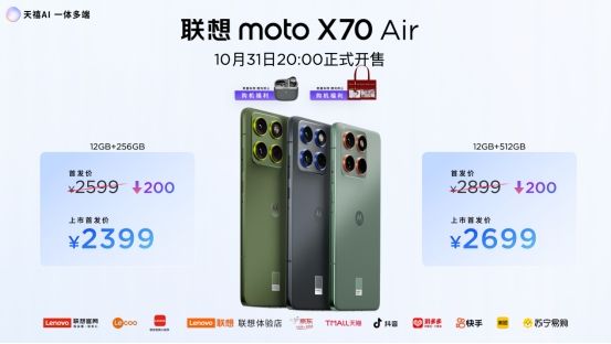 联想moto X70 Air AI手机售价2599元起,10月31日晚8时全渠道正式开售,首销福利限时优惠仅2399元起,还可享国补和平台补贴等多重优惠。