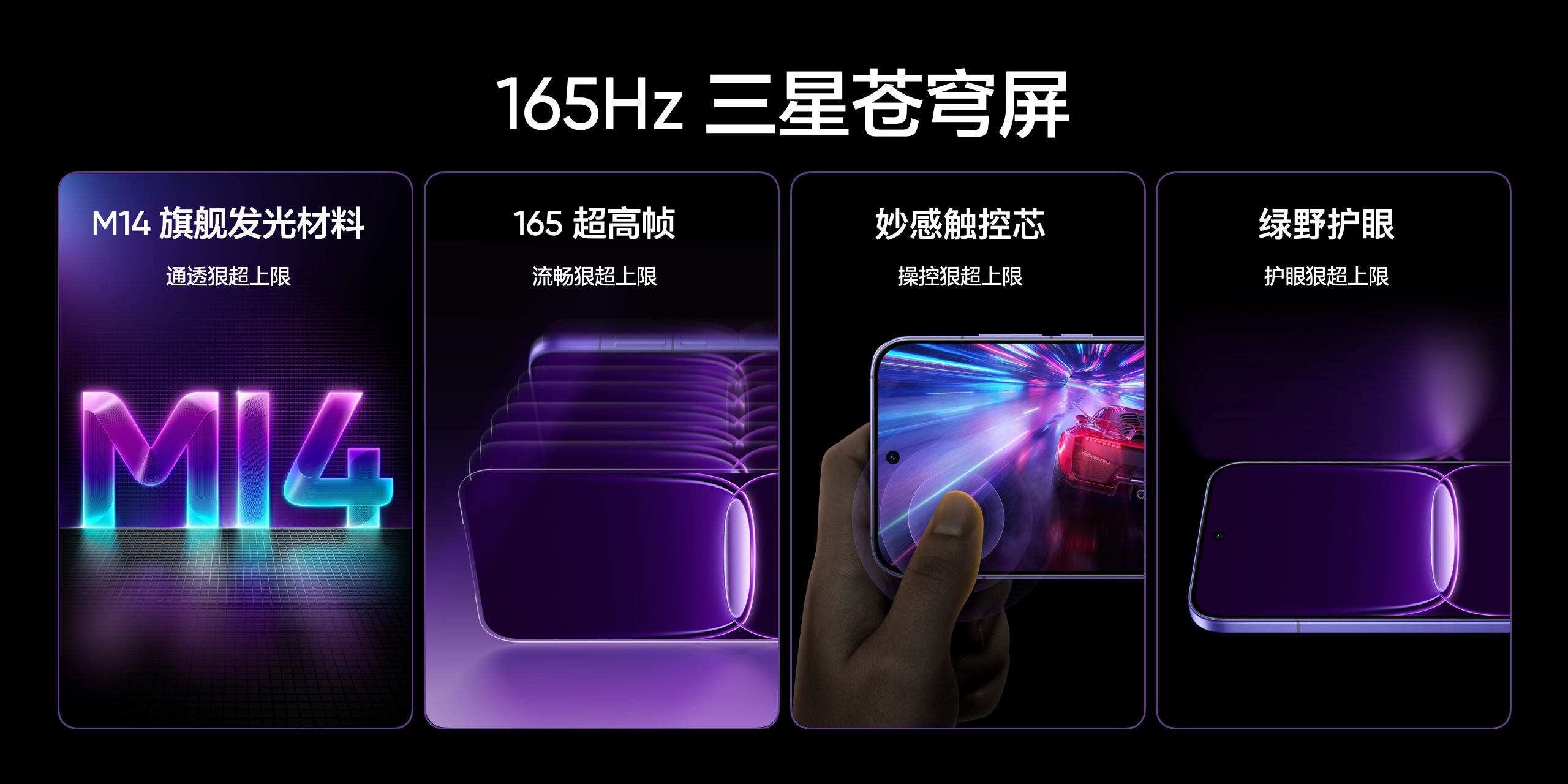 2026年,真我Neo8携手三星显示独家定制165Hz三星苍穹屏,通透、流畅、操控、护眼四大维度实现全面越级,重新定义新一代潮玩电竞旗舰的屏幕上限。