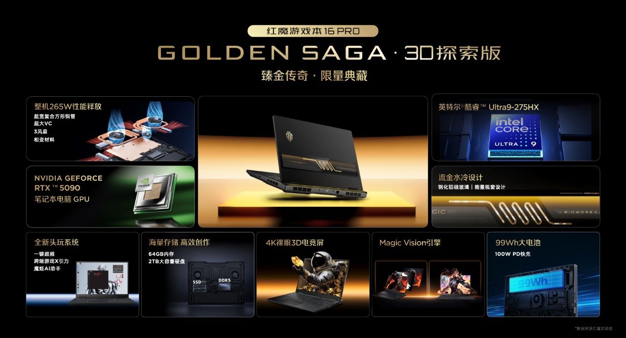 在游戏本上,红魔游戏本16 Pro全新升级GOLDEN SAGA·3D探索版,搭载英伟达5090显卡,拥有64GB+2TB存储,并且首次在笔记本上带来了流金水冷设计。